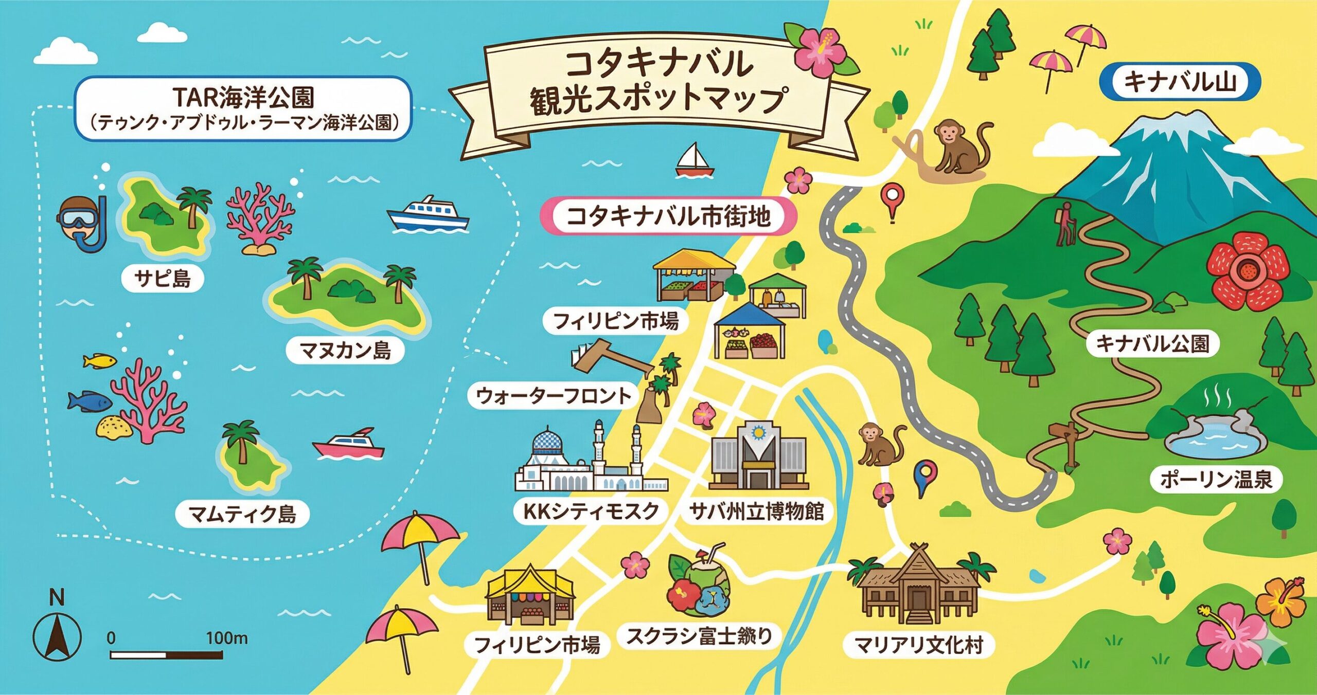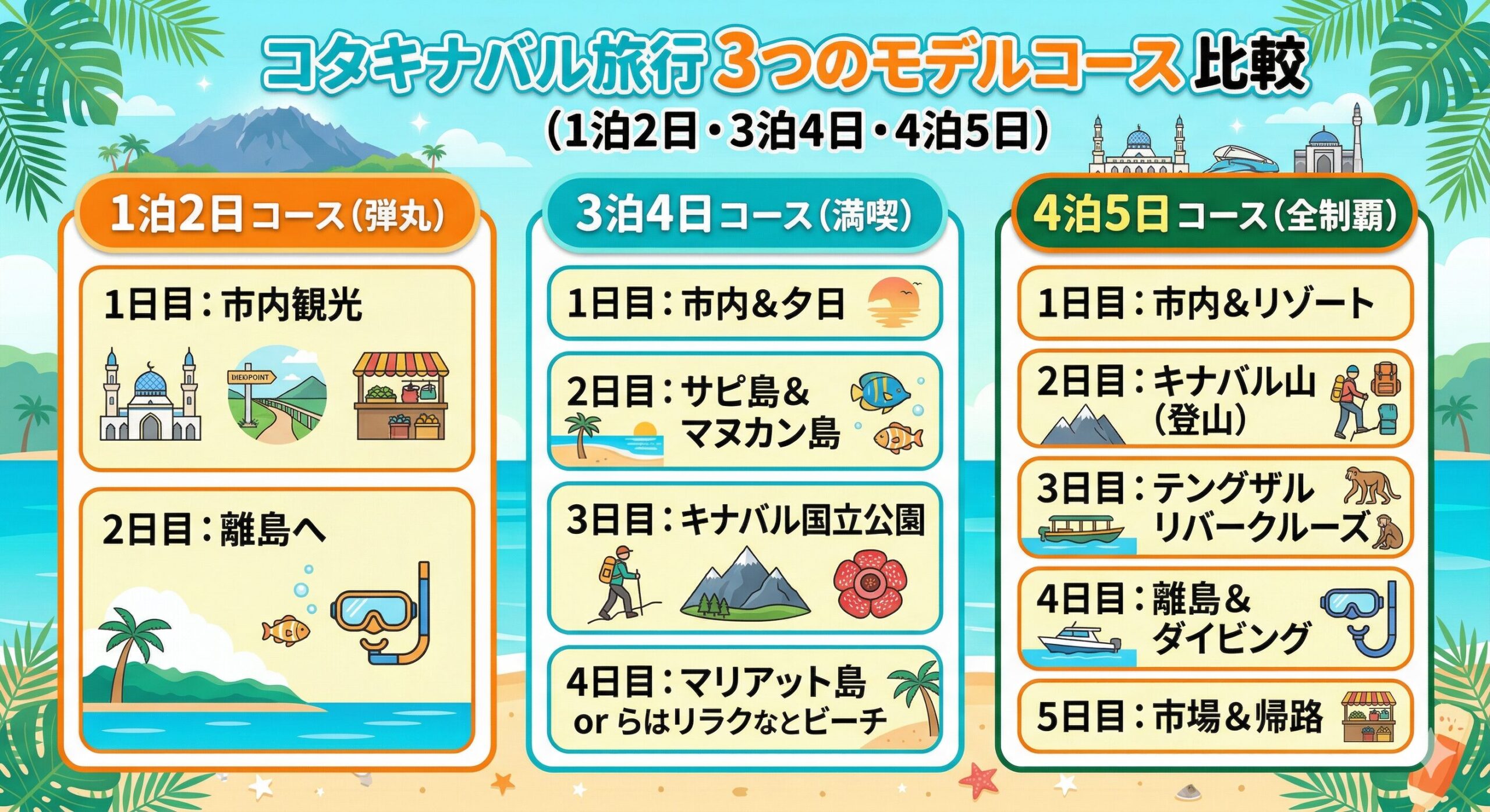 コタキナバルの魅力は大きく4つ。海(ビーチ・シュノーケリング・ダイビング)、山(東南アジア最高峰のキナバル山)、野生動物(オランウータン・テングザル)、そしてローカルグルメです。1泊2日でも十分楽しめますが、時間が許すなら4〜5日かけてじっくり回るのがおすすめです。